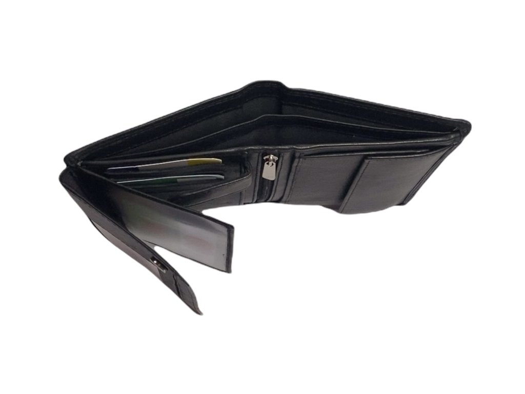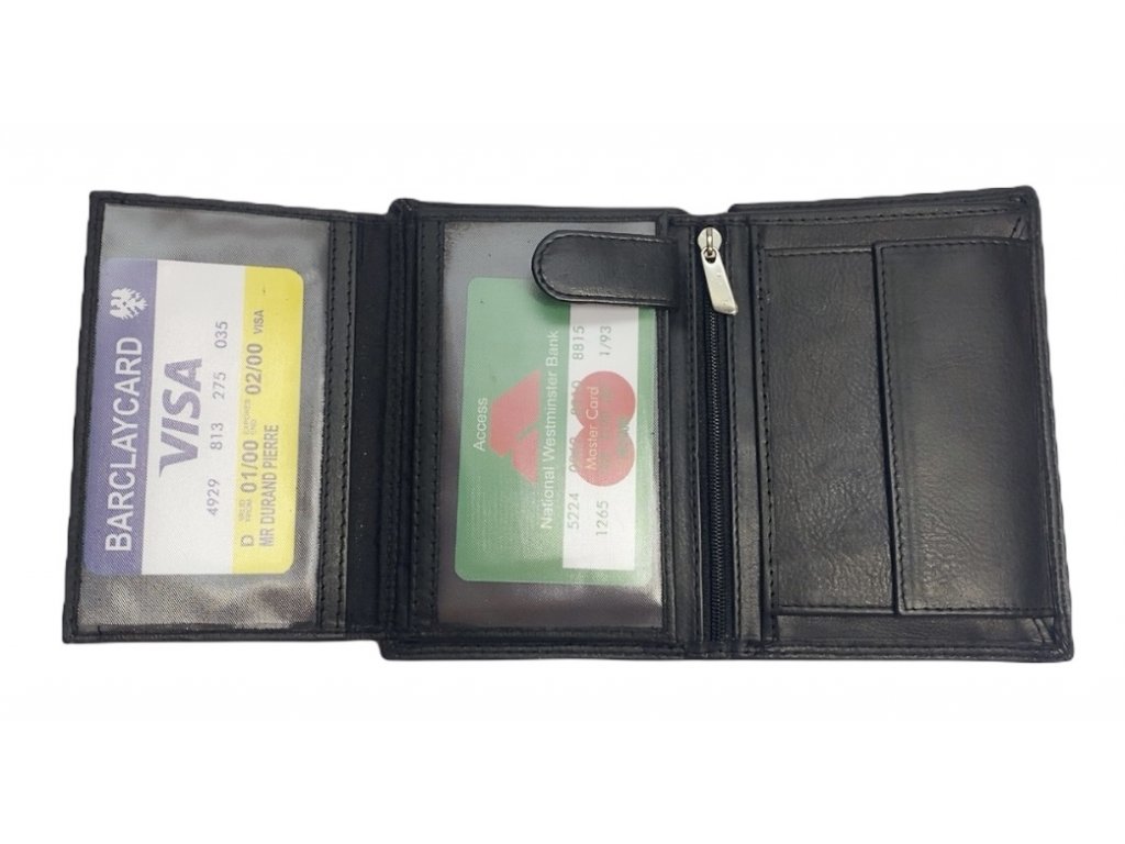 Dámská peněženka je vyrobena z pravé kůže v klasické černé barvě a doplněna přezkou. Uvnitř najdete přihrádky na bankovky, platební karty a kapsičku na mince.