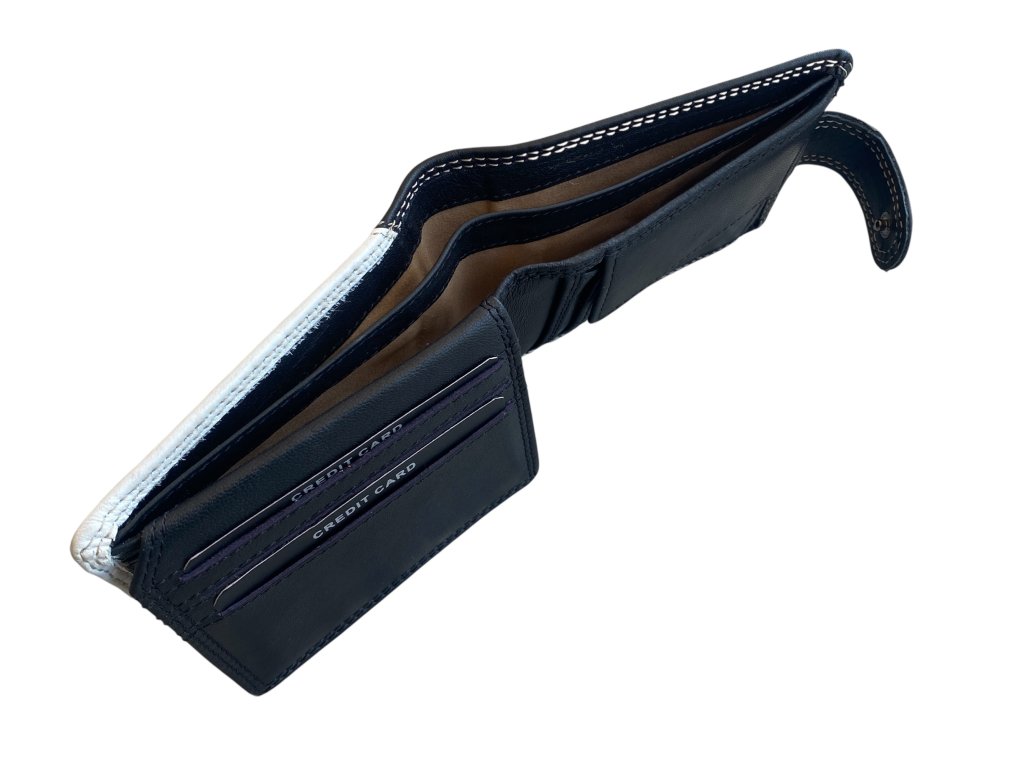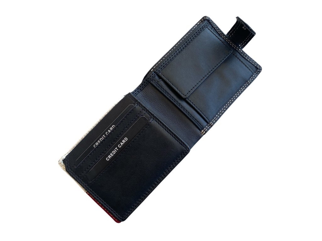 Tmavě modrá a červená dámská kožená peněženka se zápinkou. Uvnitř najdete přihrádky na bankovky, platební karty a kapsičku na mince. Jsme přímým výrobcem a distributorem zboží