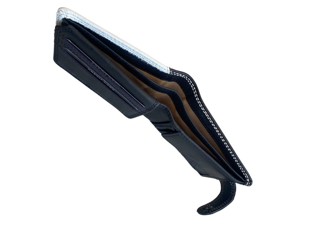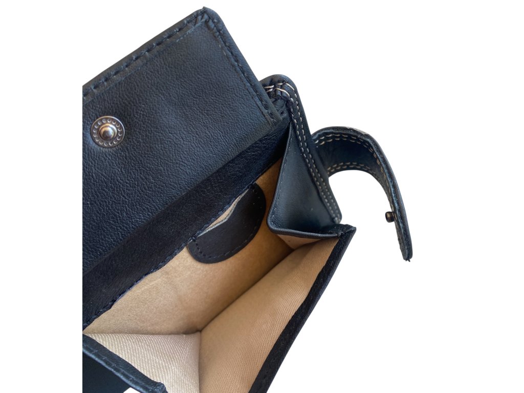 Stylová a kompaktní pánská peněženka vyrobená z kvalitní pravé kůže v elegantní černé barvě. Precizní dvojitý steh se speciální nití zajišťuje vysokou odolnost a dlouhou životnost.