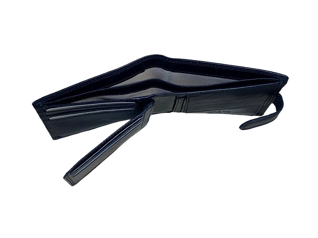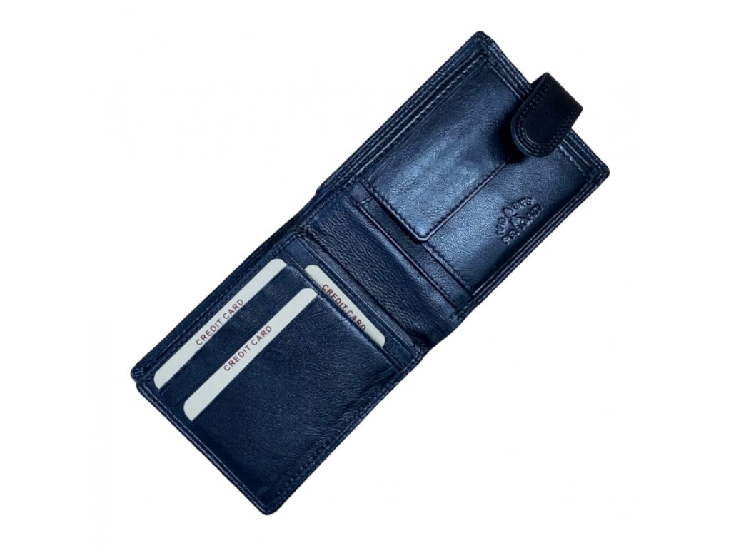 Stylová a odolná pánská peněženka vyrobená z pravé kůže v elegantní černé barvě. Precizní dvojitý steh speciální nití zajišťuje dlouhou životnost a pevnost i při každodenním používání. Praktická přezka chrání obsah peněženky a dodává jí moderní vzhled.